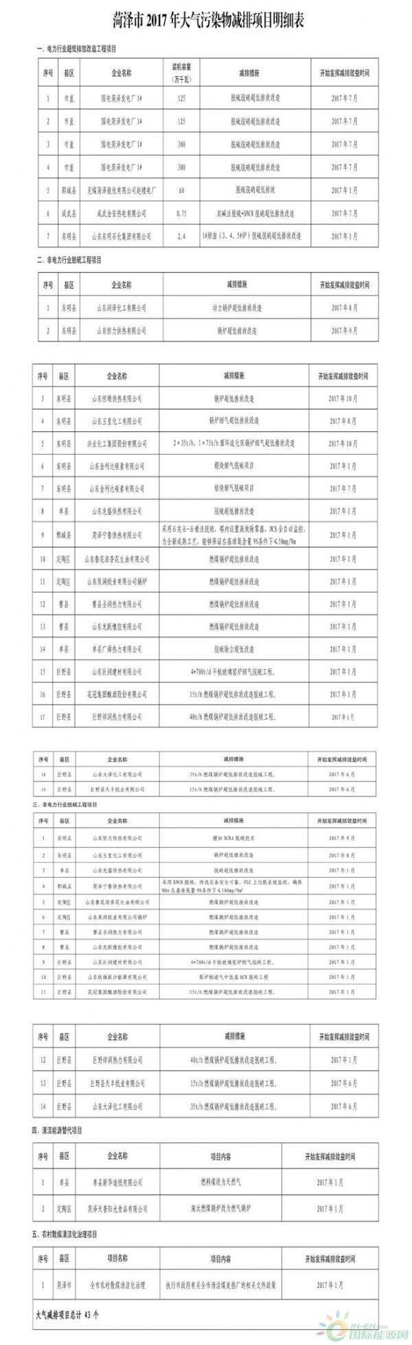 《2017年菏泽市主要污染物总量减排年度计划》已经公布。涉及水减排项目116个,大气减排项目43个,涉及超低排放、脱硝改造等。详情如下: