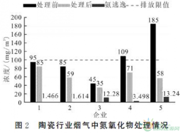 脱硝技术是陶瓷行业废气中氮氧化物的治理的主要手,通过喷还原剂,如氨、尿素等,对氮氧化物进行处理。此方法虽然有效,但对反应温度有所要求,陶瓷行业采用时往往会因为废气温度达不到其反应温度而影响其脱硝效率。从25家陶瓷企业中选取5家具有代表性意义的企业进行分析,从图2中可得知,虽然治理后几家陶瓷行业的废气均达到氮氧化物排放标准,但脱硝效率普遍不高,同时,企业3和5存在较为明显的氨逃逸情况。