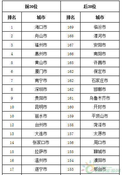 2018年12月169个重点城市排名前20位和后20位城市名单