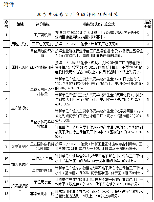 9月11日,北京市经信局日前发布关于征求《北京市绿色制造单位管理暂行办法(征求意见稿)》意见的通知,建立绿色工厂分级评价机制。根据分级评价指标及评分标准,对已入围国家级绿色工厂开展分级评价。评价指标中,可再生能源利用率最高得到6分,按照指标说明及计算公式标准,企业直接利用的可再生能源占能源使用比例(可再生能源包括太阳能、水能、风能、生物质能、地热能、波浪能、潮汐能、海洋温差能等),可再生能源利用率应大于5%,利用率大于15%为满分。