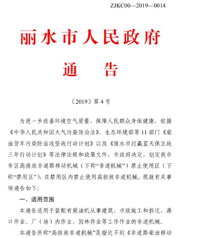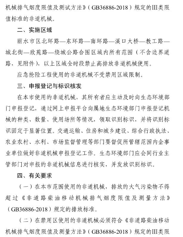 (4)禁用区具体范围和排放标准详见《丽水市人民政府关于禁止使用高排放非道路移动机械区域的通告》(〔2019〕第4号)。